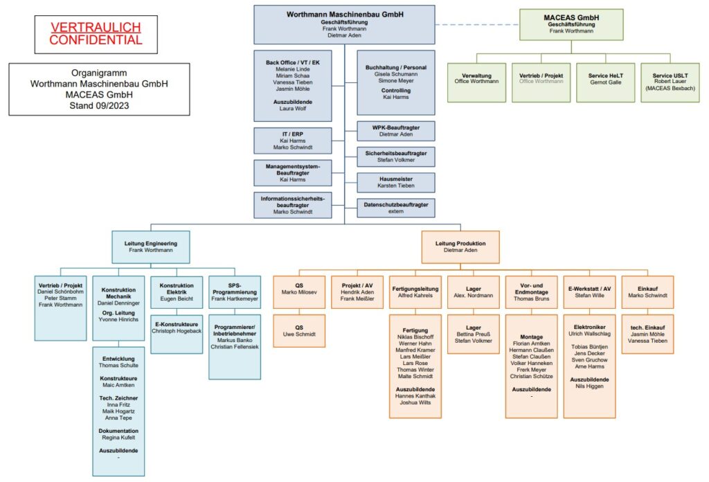 Hier findet ihr unser aktuelles Organigramm der Worthmann Maschinenbau GmbH und MACEAS GmbH: