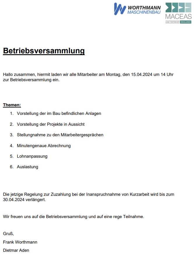 Hiermit laden wir euch zur nächsten Betriebsversammlung am Montag, den 15.04.2024 um 14.00 Uhr ein.